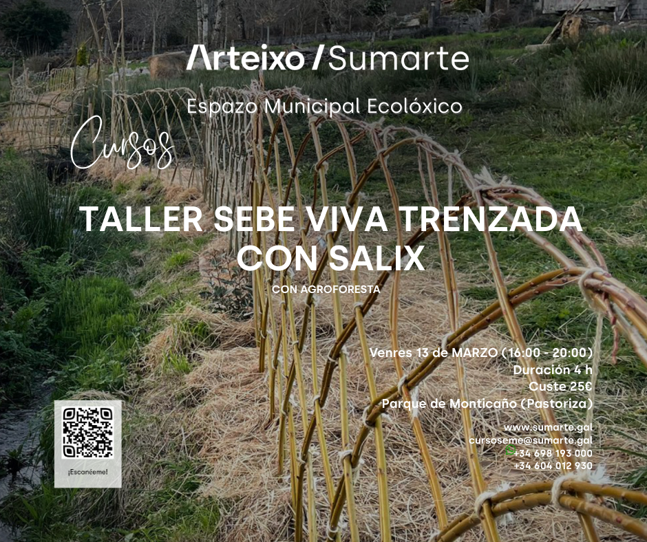 Impartido por Rubén Escuredo, da empresa especializada Agroforesta, este taller de catro horas (de 16:00 a 20:00 h) está deseñado para un nivel de INICIACIÓN. O obxectivo é que os participantes aprendan a deseñar e crear unha sebe viva trenzada empregando vimbios de Salix (salgueiro), unha especie idónea para este fin pola súa flexibilidade e capacidade de enraizamento.