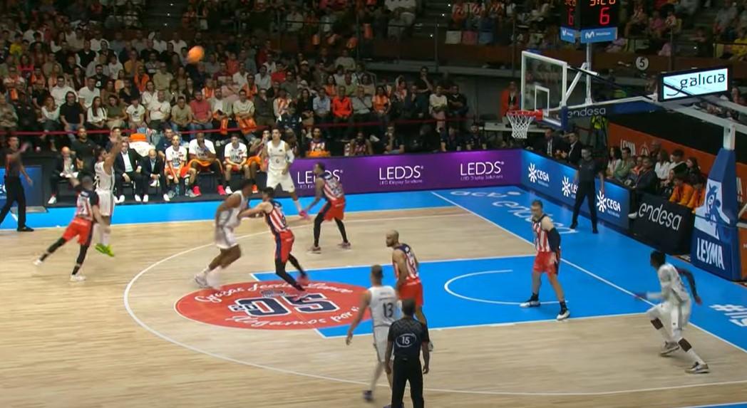 Con 44-18 y a falta de 3:38,Epi solicita tiempo muerto para tratar de insuflar ánimo a sus jugadores, que habían encajado un 70% de los triples intentados por el Real Madrid y que tan solo habían anotado el 33% de sus tiros desde el perímetro. Las instrucciones hacen efecto y los visitantes endosan un parcial de 2-12 a los blancos, para llegar al descanso con otro tapón de Diagné y un marcador de 46-30.