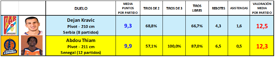 Por último, en lo que respecta al juego interior, las estadísticas también están igualadas, aunque la fortaleza en la captura de rebotes se decanta a favor de los pívots visitantes: