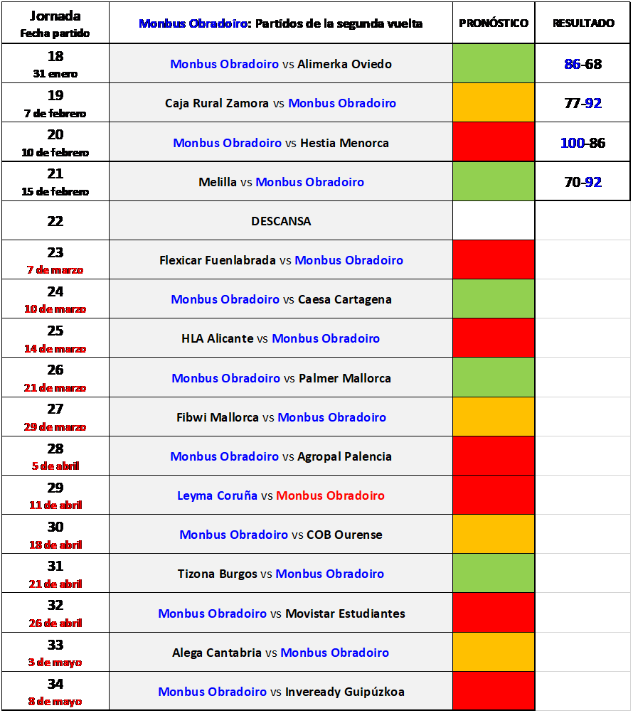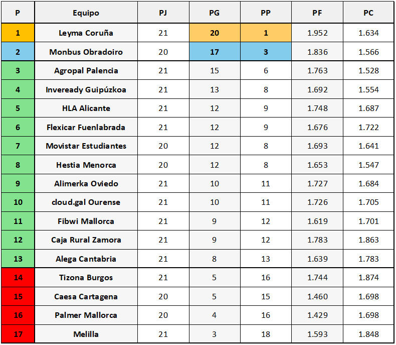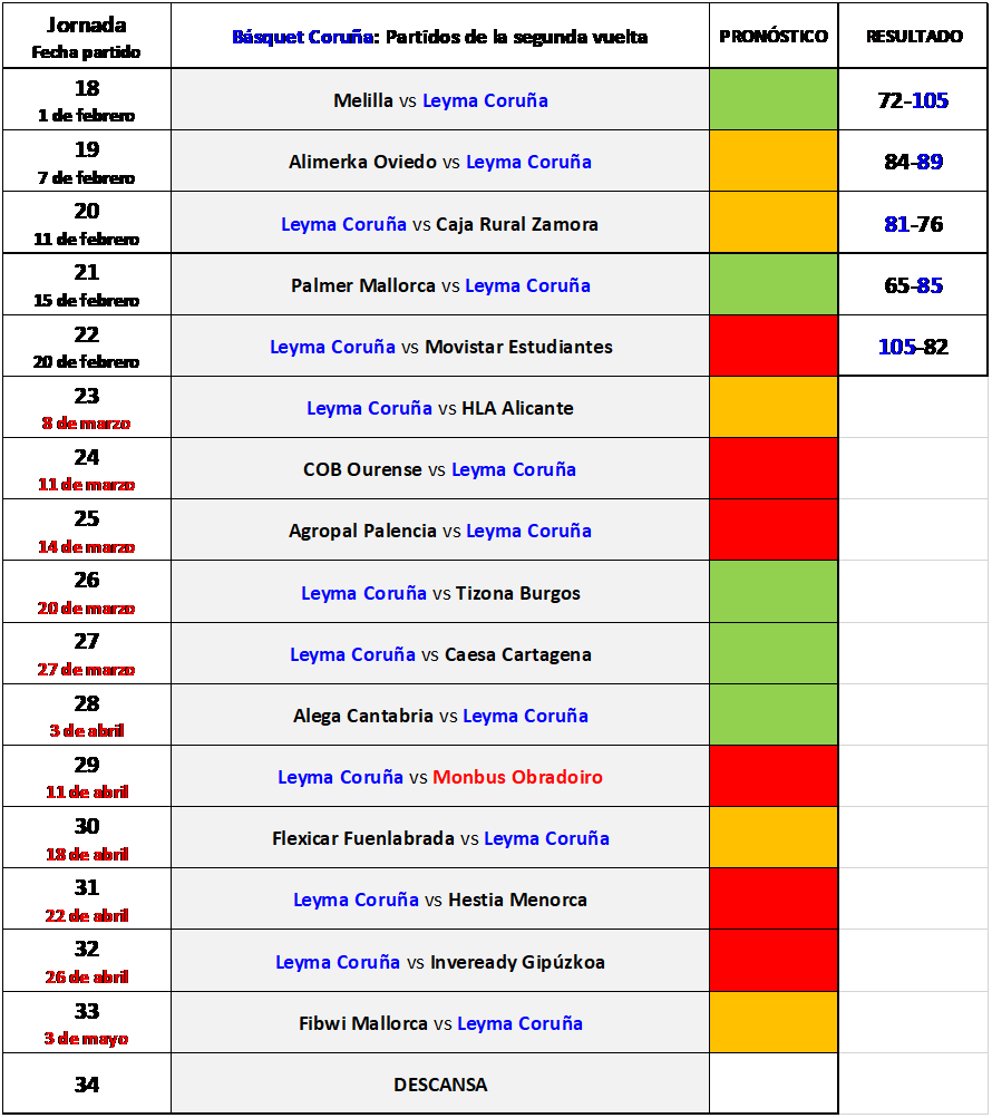 Llevamos cinco partidos disputados de la segunda vuelta y todo indica que la disputa del primer puesto, que permite el ascenso directo a ACB, es cosa de dos equipos: Leyma Coruña y Monbus Obradoiro.