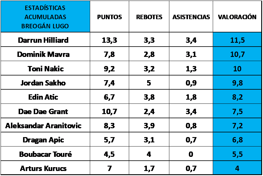 El Río Breogán anota 78 puntos de media por partido, con un 35,8% de acierto en tiros de tres, captura 33,8 rebotes por encuentro, reparte 16,3 asistencias y pierde 14,5 balones.