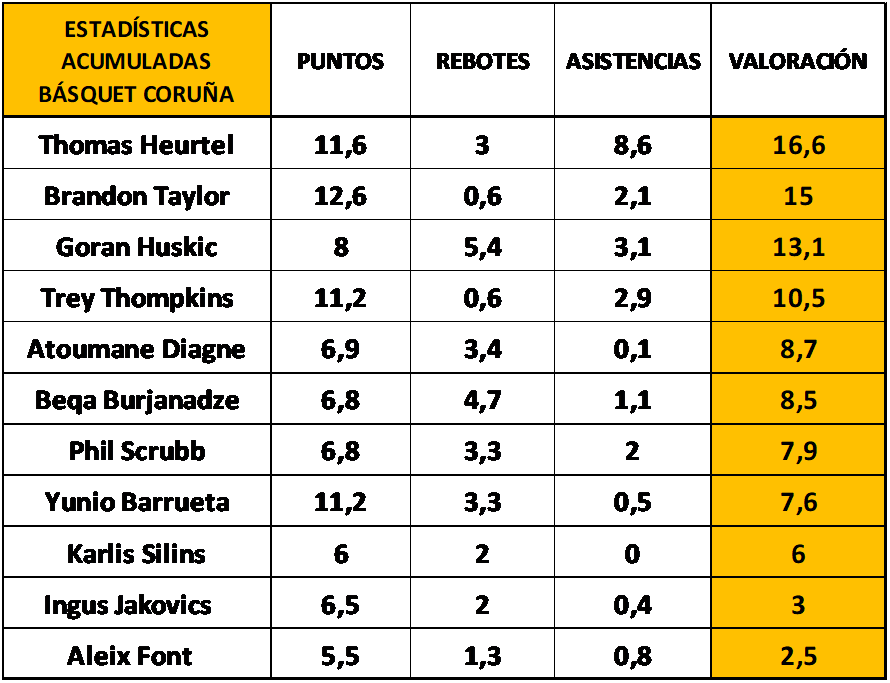 El Leyma Coruña anota 84,9 puntos de media por partido, con un 35,7% de acierto en tiros de tres, captura 36,3 rebotes por encuentro, reparte 20,8 asistencias y pierde 13,9balones. El punto negro lo encontramos en la defensa, ya que el equipo naranja tiene el peoríndice defensivo (puntos recibidos por 100 posesiones) de toda la Liga ACB con 122 puntos, mientras en el Breogán es de 112,1 puntos.