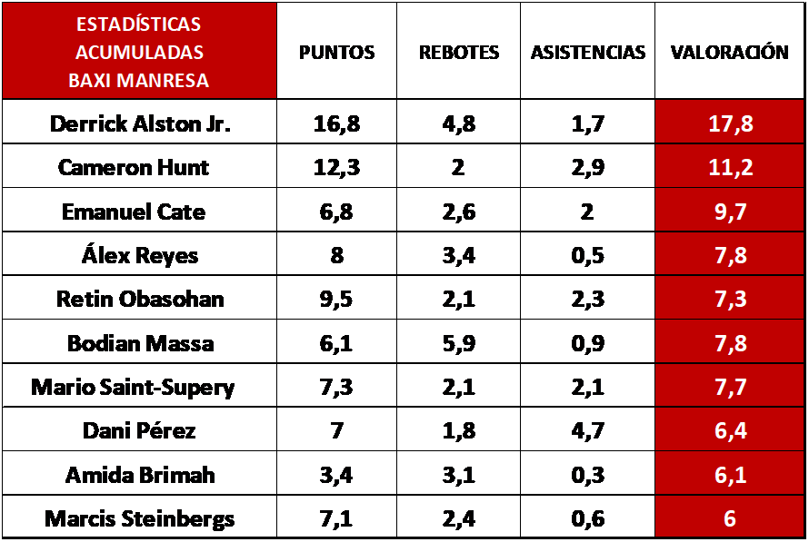 El Baxi Manresa anota una media de 87,3 puntos por partido, con un 33,9% de acierto en tiro exterior, captura 36,9 rebotes y reparte 17,3 asistencias. Por otro lado, tan solo posee un 79,6% de acierto en tiro libre y pierde 14,8 balones por partido.