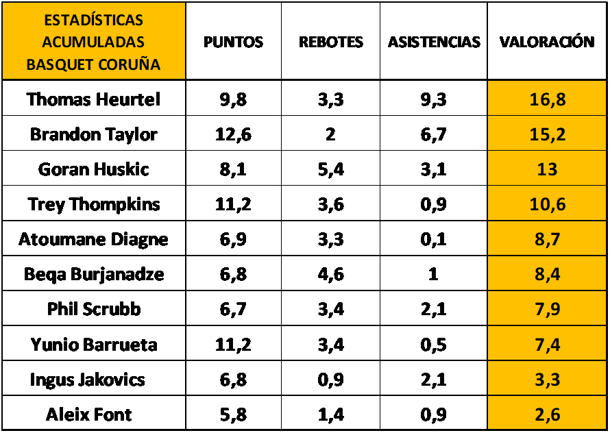 El Leyma Coruña anota una media de 84,7 puntos por partido, con un 35,4% de acierto en tiro exterior, captura 36,1 rebotes y reparte 20,7 asistencias. Por otro lado, posee un peor porcentaje de acierto en tiro libre (73,2%) y pierde menos balones por partido (13,6).