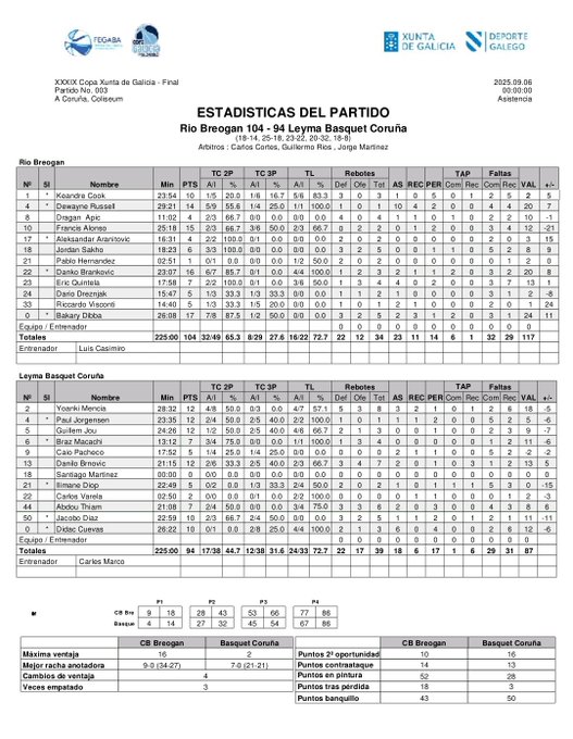Agotados por el esfuerzo de la remontada, al Leyma se le acabó el fuelle. En los cinco minutos suplementarios, solo hubo un equipo en la pista. El Breogán, recuperado de la conmoción, mostró su superioridad y aplomo, dominando cada posesión hasta marcar una diferencia de 10 puntos que dejó el marcador final en 104-94.