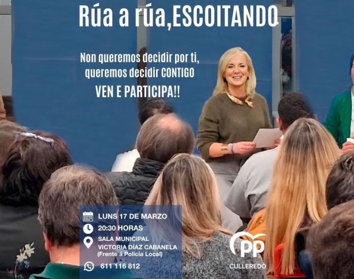El Partido Popular (PP) de Culleredo continúa avanzando en su iniciativa «Rúa a rúa, escoitando», un proyecto que tiene como objetivo principal conocer de primera mano las necesidades, quejas y propuestas de los vecinos del municipio. La próxima cita tendrá lugar el lunes 17 de marzo a las 20:30 horas en la Sala Municipal Victoria Díaz Cabanela, situada en la rúa María Cagiao, detrás del cuartel de la Guardia Civil. En esta ocasión, los habitantes de O Portádego, A Corveira y Monte Alfeirán están convocados para participar y expresar sus preocupaciones.