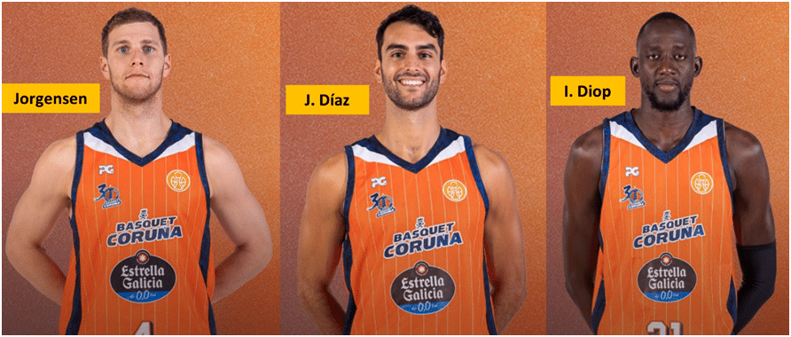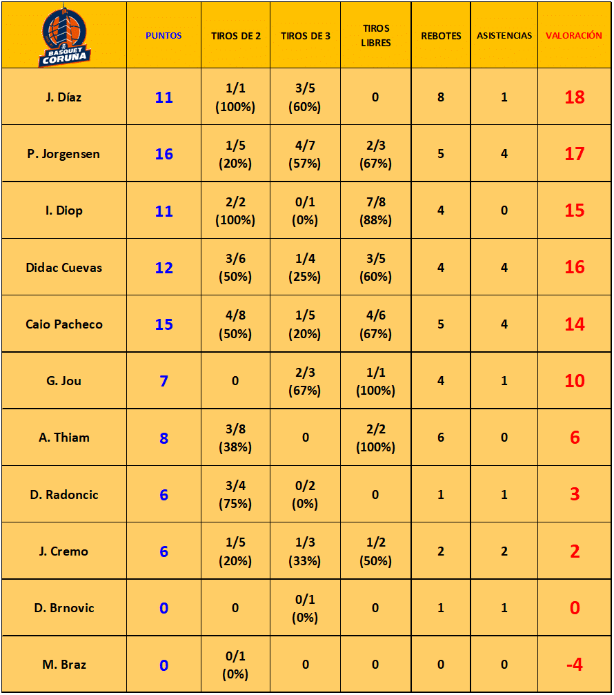 Por parte del Leyma Coruña, volver a resaltar la sangre fría y la fiabilidad de JacoboDíaz y de Jorgensen en los momentos calientes del partido, la actuación completa en ataque y defensa deDiop, la dirección de Pacheco y Cuevas y la capacidad de lucha de Jou y Thiam. De este último, destacar su brillante defensa a los pívots locales al final del encuentro y su fortaleza en la captura de los rebotes cuando más falta hacía no dar segundas oportunidades al rival.
