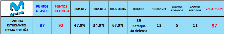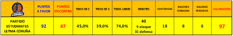 En estos encuentros entre equipos con gran potencia ofensiva, el resultado se decanta gracias a pequeños detalles. Si bien el Movistar Estudiantes comenzó con un porcentaje demoledor del 70% de acierto en triples en el primer cuarto, al final el Leyma Coruña logró un mejor porcentaje en el tiro exterior (39% frente a 34%), repartió más asistencias, robó más balones al equipo contrario y controló mejor la pérdida de balones.