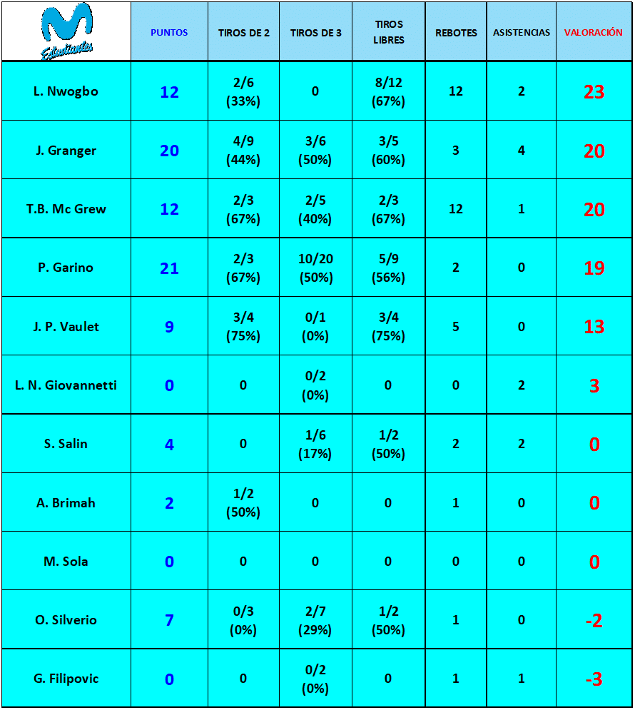 Destacar la aportación de Granger (11), Garino (9) y Lotana (8) por los locales y de Cuevas (9), Pacheco (8) y Cremo (6) por los visitantes. Aunque el equipo estudiantil perdió más balones (6 frente a 2), la clave del resultado al descanso era su mejor eficacia en el tiro exterior: 9 triples para un 45% de acierto frente a 4 triples de los visitantes, con tan solo un 22% de eficacia.