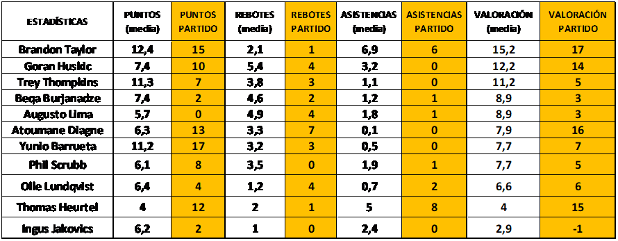 90 – Leyma Coruña (20+19+23+28): Brandon Taylor (15), Lundqvist (4), Barrueta (17), Thompkins (7) y Lima (-) -quinteto inicial-; Burjanadze (2), Huskic (10), Diagne (13), Heurtel (12), Phil Scrubb (8) y Jakovics (2).