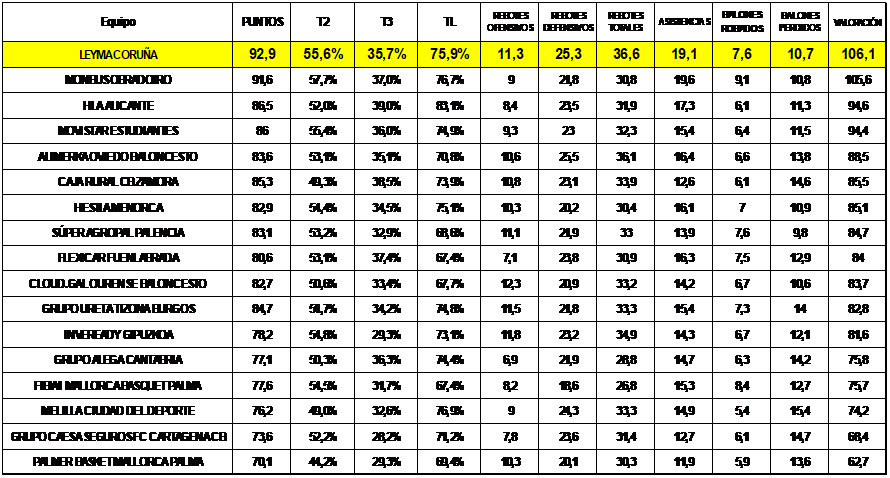 Por otro lado, es el segundo equipo con mejor eficacia (55,6%) en tiros de dos puntos, tras Obradoiro, el séptimo en triples (35,7%) – aquí hay margen de mejora – y el cuarto en tiros libres (75,9%). También han mostrado otra fortaleza importante, ya que son líderes en captura de rebotes totales con 36,6 por partido (segundos en rebotes defensivos y cuartos en ofensivos) y también ocupan el segundo lugar en asistencias (19,1), el tercero en balones robados (7,6) y también el tercerocon menos balones perdidos (10,7). Gracias a esta regularidad, ocupa el primer lugar en la tabla de clasificación de los equipos con mejor valoración.