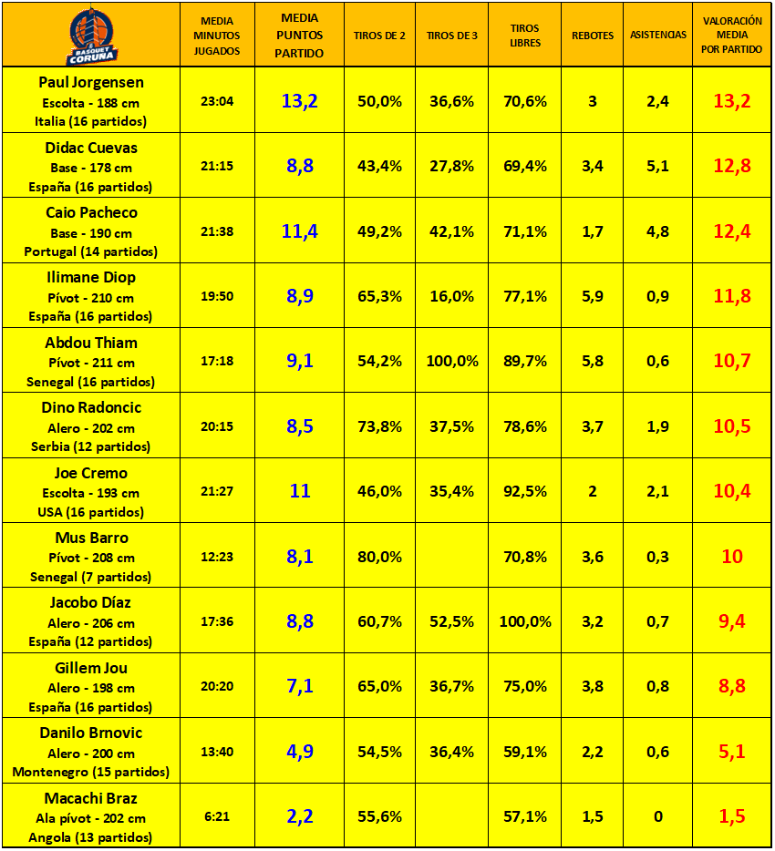 Caio Pacheco (8): Tras perderse dos partidos por lesión, ha tomado las riendas del equipo y es uno de los jugadores más completos, con buena eficacia en el tiro y visión de juego para buscar asistencias. Ha mejorado la eficacia en lostriples, pero a veces retiene demasiado el balón y fuerza situaciones ofensivas poco claras. También debe evitar las «faltas tontas» que le pueden llevar al banquillo.