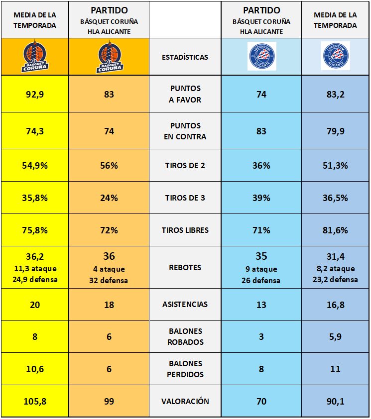 Los naranjas pudieron capturar más rebotes en defensa que sus rivales (32 vs 26), pero en los ofensivos presentaron un balance pírrico (4 vs 9), lo que permitió contraataques y canastas fáciles de los alicantinos. Otro aspecto favorable a los locales fue el reparto de asistencias (18 vs 13), lo que facilitó canastas espectaculares como la que propició Didac Cuevas en el segundo cuarto con una asistencia magistral a una mano “desde su casa”, para que Cremo pudiese remontar la línea de fondo y anotar a aro pasado.