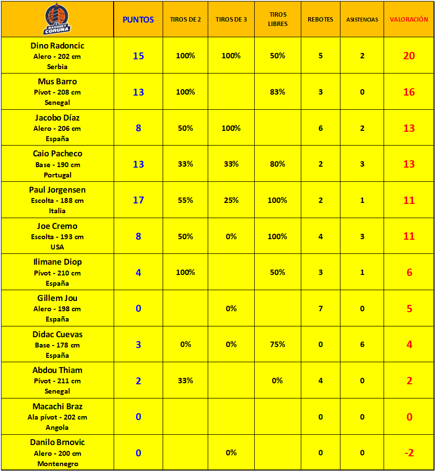 Seis jugadores de Leyma Coruña alcanzaron dobles dígitos de valoración. El MVP del partido ha sido Dino Radoncic (15 puntos, 5 rebotes y 2 asistencias), uno de los pocos jugadores que ha puesto un poco de sensatez y de juego práctico al encuentro.