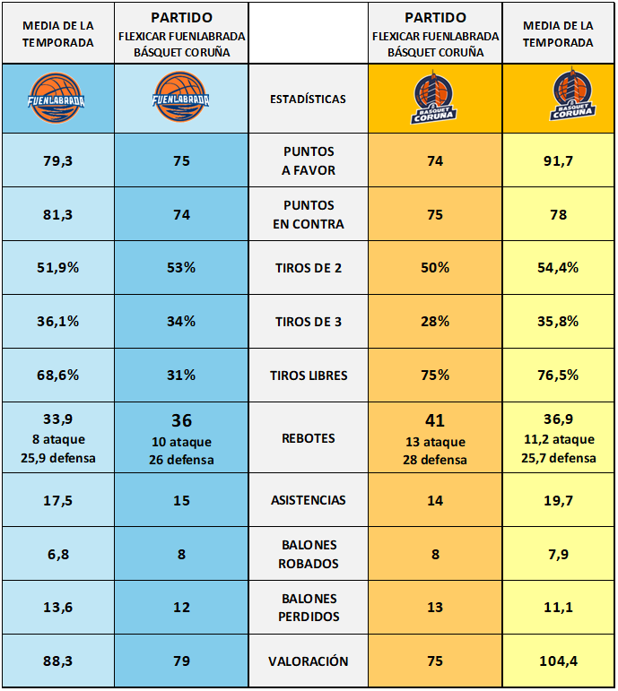 Lo primero que llama la atención es que Flexicar Fuenlabrada logró encajar menos puntos de lo que es habitual, merced a un pobre porcentaje de triples del Leyma Coruña (11/39 para un 28%) y a pesar de que los locales se permitieron el lujo de fallar hasta 11 tiros libres (5/16 para un 31%).
