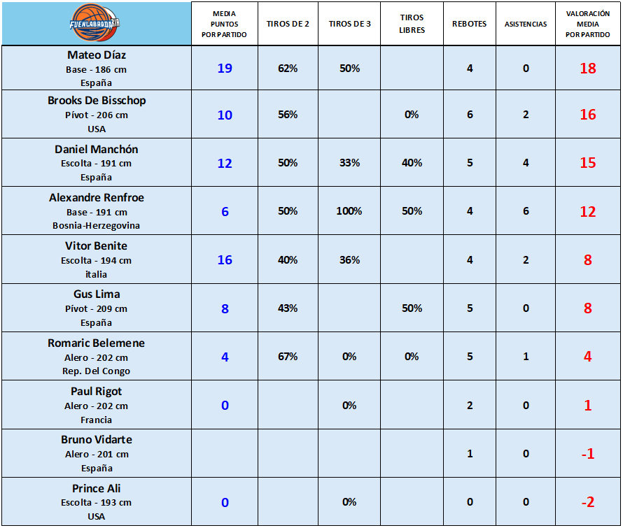 Los locales colocaron a 4 jugadores en dobles dígitos de valoración, destacando la anotación del base Mateo Díaz (19 puntos y 4 rebotes), la solidez del pívot De Bisschop (10 puntos y 6 rebotes), la seguridad del escolta Daniel Manchón para anotar en los momentos importantes (12 puntos, 5 rebotes y 4 asistencias) y la dirección de juego de Renfroe (6 puntos y 6 asistencias).