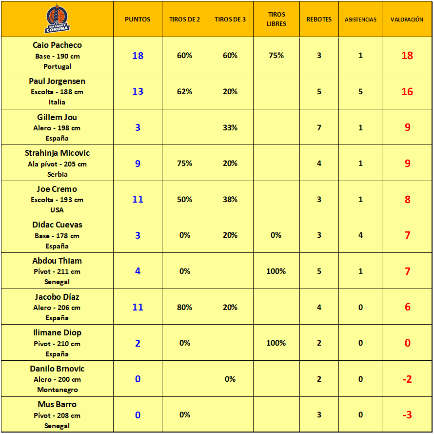 En el equipo de Carles Marco se ha producido un hecho inédito en esta temporada. Normalmente hay cinco o seis jugadores que se colocan en dobles dígitos de valoración, pero en esta ocasión tan solo dos jugadores pudieron alcanzar ese nivel: Caio Pacheco (18 puntos y 3 rebotes) y Paul Jorgensen (13 puntos, 5 rebotes y 5 asistencias).