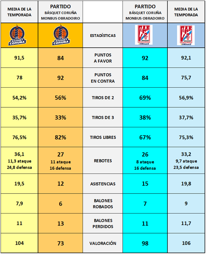 El partido ha tenido dos fases bien diferenciadas: dos primeros cuartos muy dinámicos en los que Leyma Coruña pudo desarrollar su juego vertiginoso y llegar con ventaja a descanso (41- 37) y dos últimos cuartos en los que a los locales se les agotó la gasolina yMonbus Obradoiro paró el ritmo del partido. Los visitantes manejaron con maestría el ataque posicional y realizaron una defensa asfixiante sobre el jugador con balón y sobre las primeras líneas de pase, que logró colapsar el ataque naranja. Esto, unido a una impresionante actuación ofensiva de Westermann, Munningsy Brito(47 puntos entre los tres), facilitó un parcial en los dos últimos cuartos (43 – 55) y colocó una ventaja final en el luminoso favorable a los picheleiros(84-92).