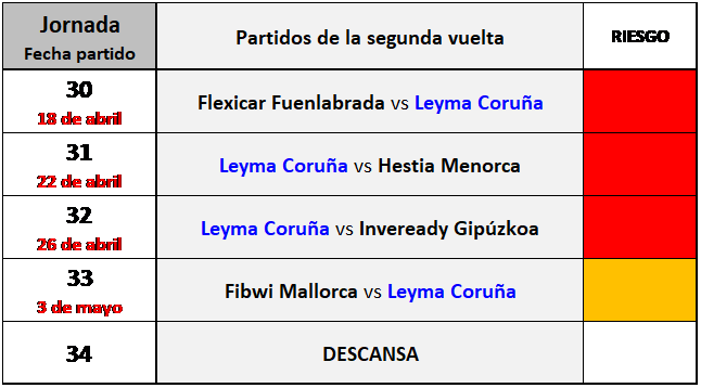 Con esta derrota, al Leyma Coruña se le complica el ascenso directo y queda a expensas de un improbable tropezón de Monbus Obradoiro en los 5 partidos que le quedan por disputar. En consecuencia, toca apretar los dientes, seguir remando, asegurar los 4 encuentros que restan hasta final de temporada y trabajar el aspecto mental en el caso de que se tengan que jugar el ascenso en el playoff.