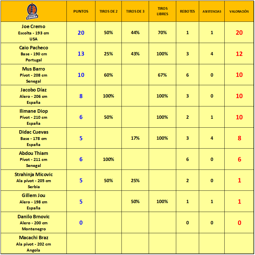 El equipo de Carles Marco presentó 5 jugadores con dobles dígitos de valoración. El MVP del partido ha sido Joe Cremo (20 puntos y 20 de valoración), escoltado por un Caio Pacheco que no estuvo muy atinado en los tiros de 2 puntos (13 puntos, 3 rebotes y 4 asistencias), por un luchador Mus Barro (10 puntos y 6 rebotes), por Jacobo Díaz (8 puntos y 3 rebotes) y por un Ilimane Diop (6 puntos y 2 rebotes) del que se esperaba algo más en este duelo trascendental.