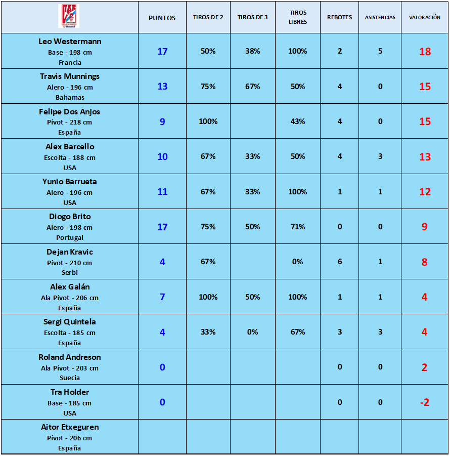 El equipo de Diego Epifanio presentó a otros 5 jugadores en dobles dígitos de valoración. Destacó un letal Leo Westermann (17 puntos, 2 rebotes y 5 asistencias), un infalible Travis Munnigs (13 puntos y 4 rebotes), un Felipe Dos Anjos que hizo una labor impresionante en el ataque y defensa del bloqueo directo (9 puntos y 4 rebotes), un Alex Barcello que siempre sumó cuando dispuso de minutos (10 puntos, 4 rebotes y 3 asistencias) y un Yunio Barrueta que fue de menos a más (11 puntos).
