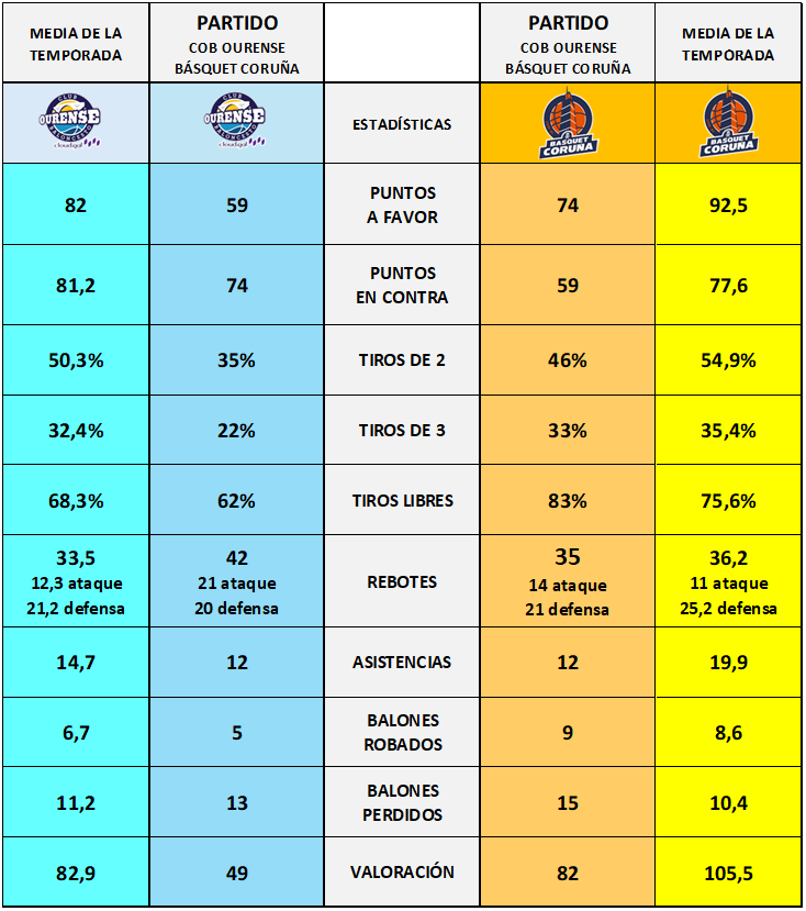 Podemos resumir las claves del partido en el gran trabajo defensivo del Leyma Coruña, que logró que el COB Ourense anotase 23 puntos menos que su media de esta temporada, y en el enorme trabajo de los locales para capturar 21rebotes ofensivos que les dieron segundas opciones de tiro para mantenerse vivos en el partido hasta bien avanzado el último cuarto.
