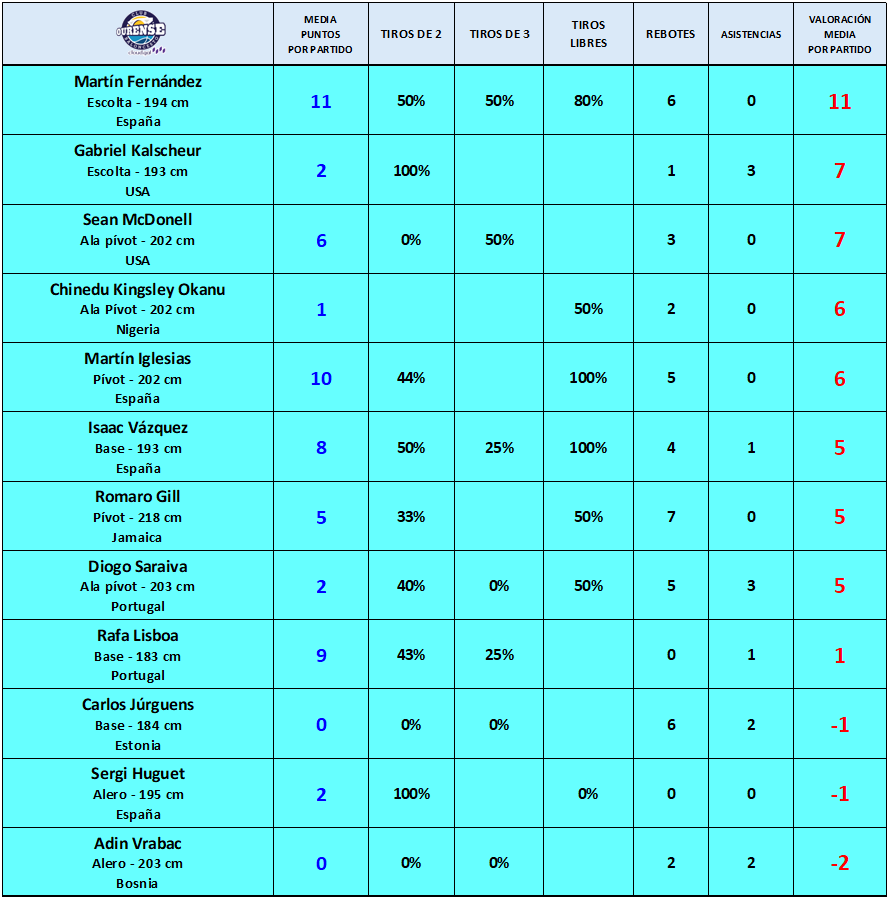 El equipo de Moncho López solo logró colocar aun jugador en dobles dígitos de valoración, el joven escolta Martín Fernández (11 puntos y 6 rebotes). Otros dos jóvenes mantuvieron una destacada aportación ofensiva: el pívot Martín Iglesias (11 puntos) y el base Isaac Vázquez (8).
