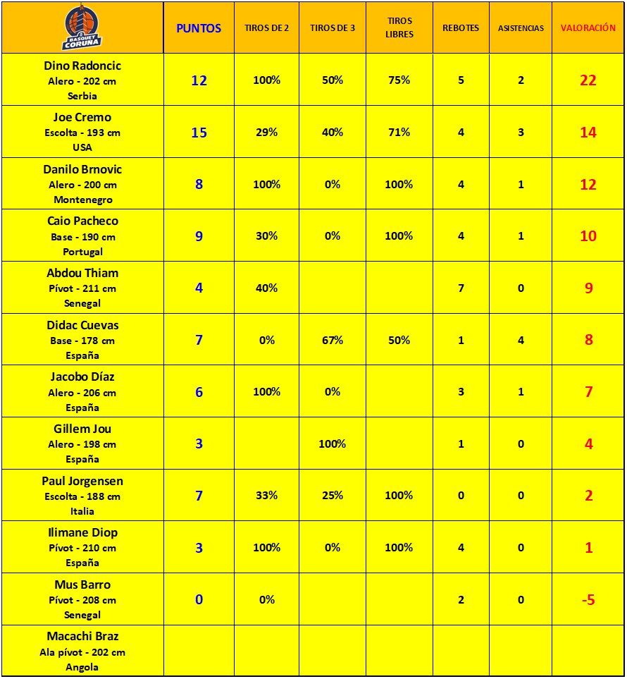 Hay que destacar que salió Brnovic en el quinteto titular, algo inusual, pero era el anticipo de una gran noche del alero montenegrino. Radoncic (4 puntos) y Cremo (4) para los visitantes y Gill (3) y Mc Donell (3) eran los anotadores destacados, y el Leyma Coruña mostraba mayor eficacia en el tiro de dos puntos (56% vs 25%).