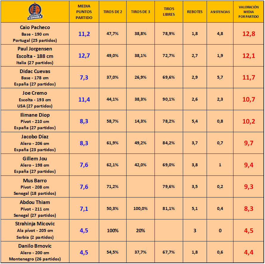 Caio Pacheco (11,2 puntos y 4,8 asistencias), Paul Jorgensen (12,7 puntos y 2,7 rebotes) y Didac Cuevas (7,3 puntos y 5,7 asistencias) lideran el ranking de los naranjas, escoltados por Joe Cremo (11,4 puntos, 2,6 revotes y 2,3 asistencias) eIlimane Diop (8,3 puntos y 5,4 rebotes).