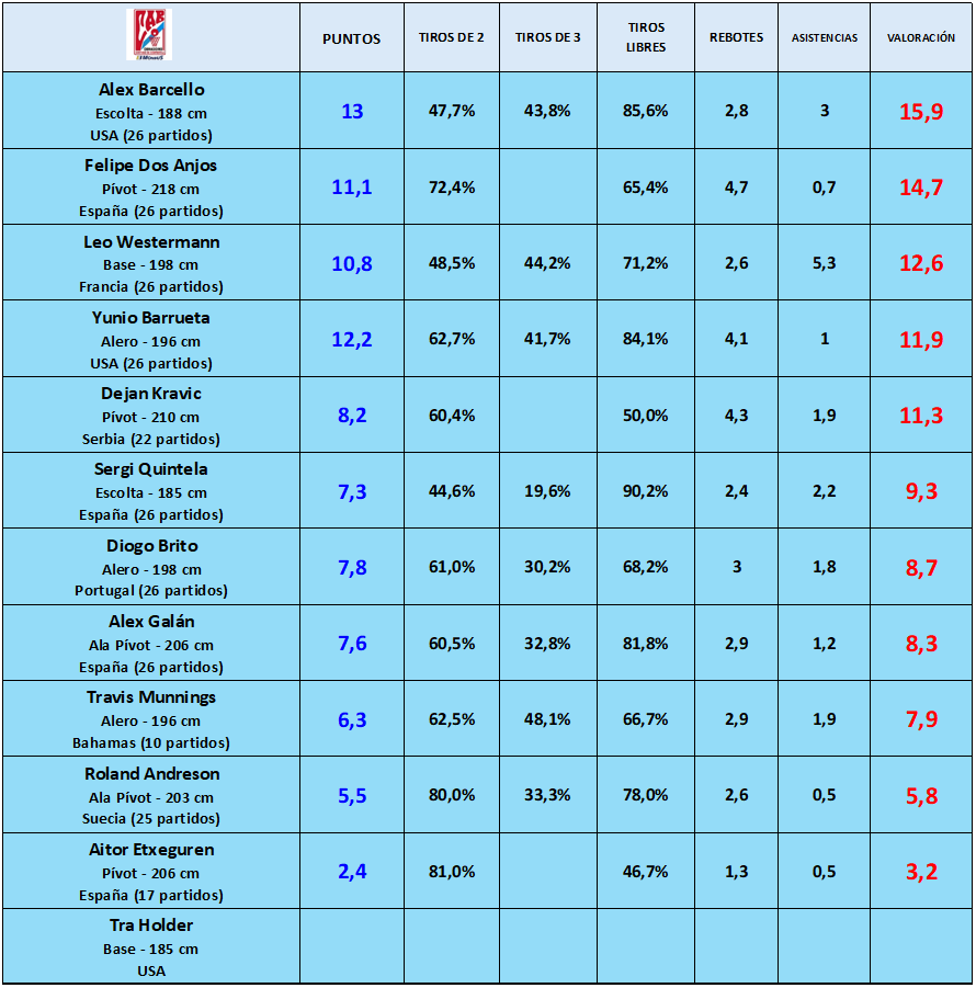 El equipo de Epi también presenta otros 5 jugadores en dobles dígitos de valoración y unocerca de esas cifras. El MVP destacado es Álex Barcello (13 puntos, 2,8 rebotes y 3 asistencias), seguido de cerca por Felipe Dos Anjos (11,1 puntos y 4,7 rebotes) y Leo Westermann (10,8 puntos, 2,6 rebotes y 5,3 asistencias). También están en ese nivel Yunio Barrueta (12,2 puntos y 4,1 rebotes) y Dejan Kravic (8,2 puntos y 4,3 rebotes), y muy cerca se encuentra Sergi Quintela (7,3 puntos, 2,4 rebotes y 2,2 asistencias).