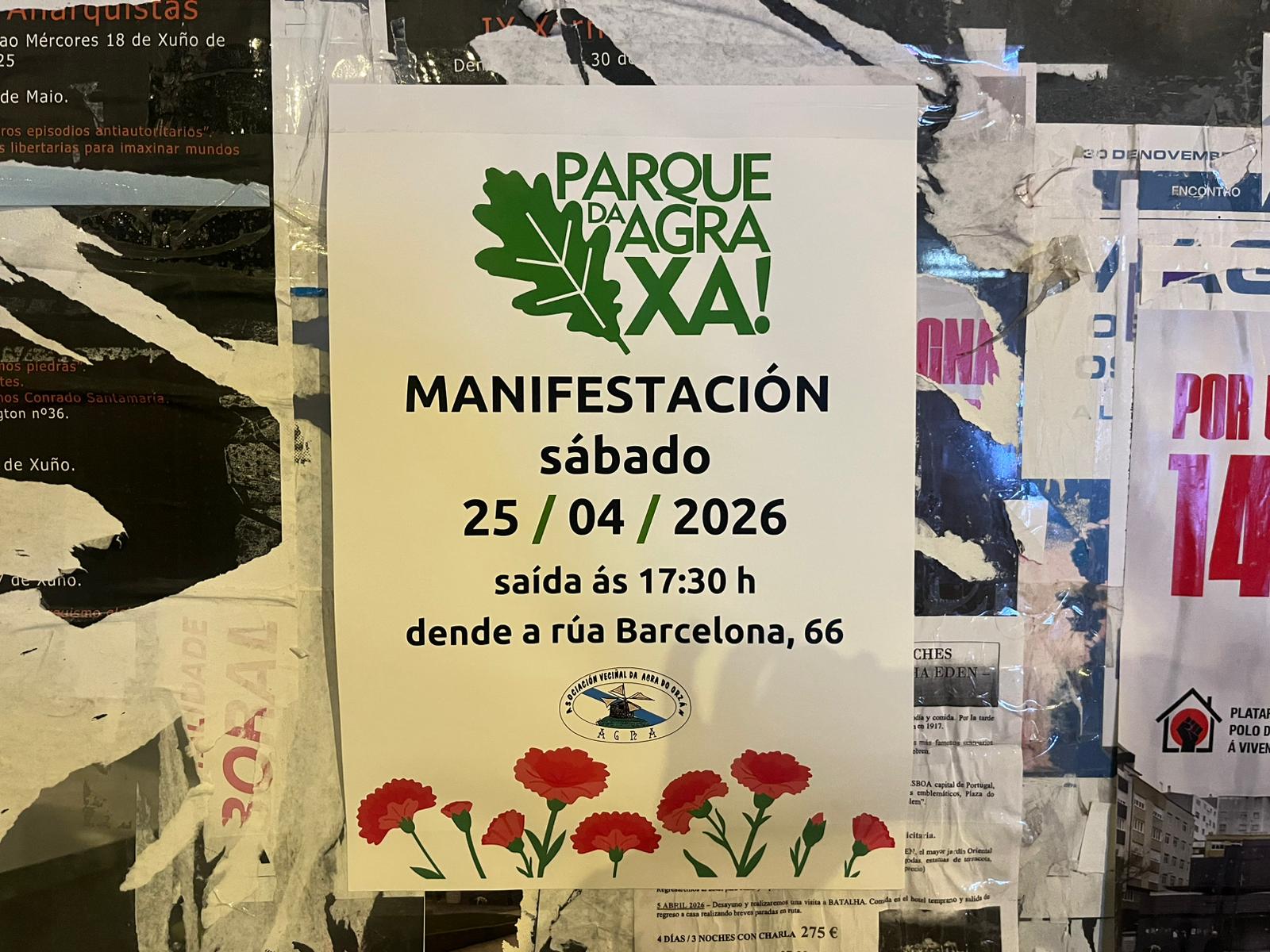 La indignación ha estallado en el Agra del Orzán. Esta misma mañana, el barrido amanecía tapizado de carteles que anuncian una movilización ciudadana para el próximo sábado 25, a las 17:30 horas, con salida desde el número 66 de la calle Barcelona. La convocatoria, lanzada por la Asociación Vecinal do Agra do Orzán, tiene un objetivo claro: exigir el tan prometido y nunca ejecutado parque del Agra, un pulmón verde que los residentes llevan años reclamando y que, según denuncian, está siendo sacrificado en favor de intereses privados.